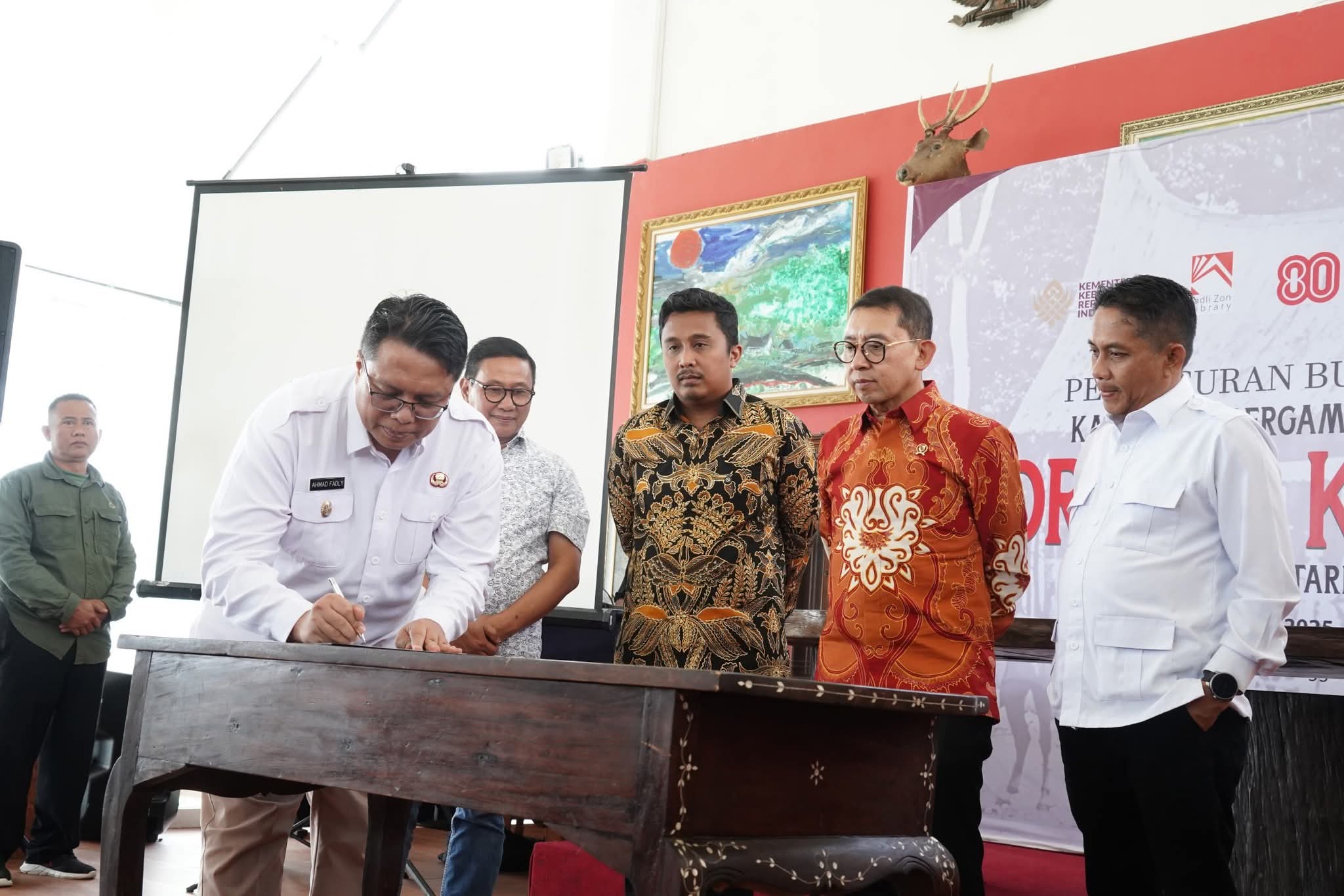 Pada kesempatan tersebut Wakil Bupati Ahmad Fadly juga menerima Buku Kartu Pos Bergambar dari Fort De Kock Padang dan sekitarnya tersebut dari Menteri Kebudayaan Fadli Zon. (El)