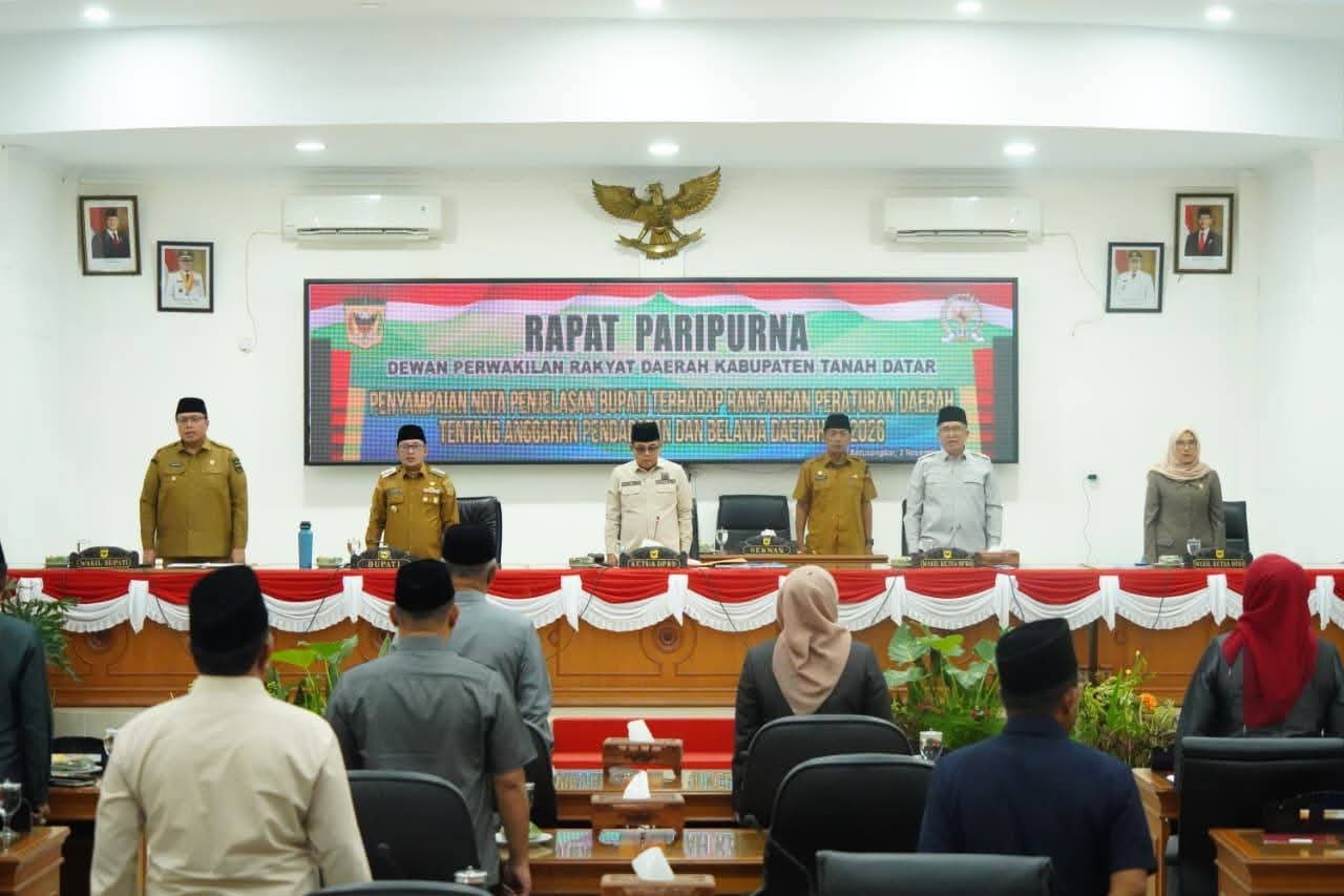 Tanqh Datar, Sumbartodaynews.id-Dewan Perwakilan Rakyat Daerah (DPRD) Kabupaten Tanah Datar menggelar Rapat Paripurna Penyampaian Nota Penjelasan Bupati Tanah Datar terhadap Rancangan Peraturan Daerah (Raperda) Anggaran Pendapatan Belanja Daerah (APBD) Tahun Anggaran 2026, yang digelar di Ruang Sidang Utama gedung DPRD setempat, Senin (3/11).