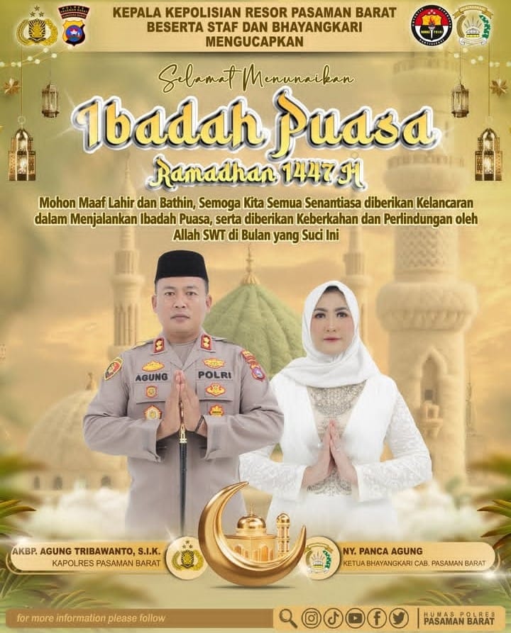 PASAMAN BARAT | Menyambut datangnya bulan suci Ramadan 1447 Hijriah, Kepala Kepolisian Resor Pasaman Barat AKBP Agung Tribawanto, S.I.K., bersama Ketua Bhayangkari Cabang Pasaman Barat Ny. Panca Agung serta jajaran Polres Pasaman Barat menyampaikan ucapan selamat menunaikan ibadah puasa kepada seluruh masyarakat. Ucapan tersebut disampaikan sebagai bentuk kepedulian, kedekatan, dan komitmen Polri dalam menjaga harmoni di tengah masyarakat.