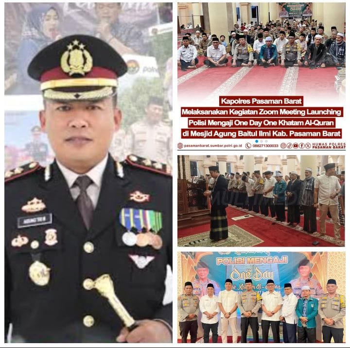 PASAMAN BARAT | Kapolres Pasaman Barat AKBP Agung Tribawanto menegaskan komitmennya membangun institusi kepolisian yang tidak hanya profesional dalam tugas, tetapi juga kuat secara spiritual. Komitmen itu terlihat dalam kegiatan Launching “Polisi Mengaji One Day One Khatam Al-Qur’an” yang digelar di Masjid Agung Baitul Ilmi Kabupaten Pasaman Barat.