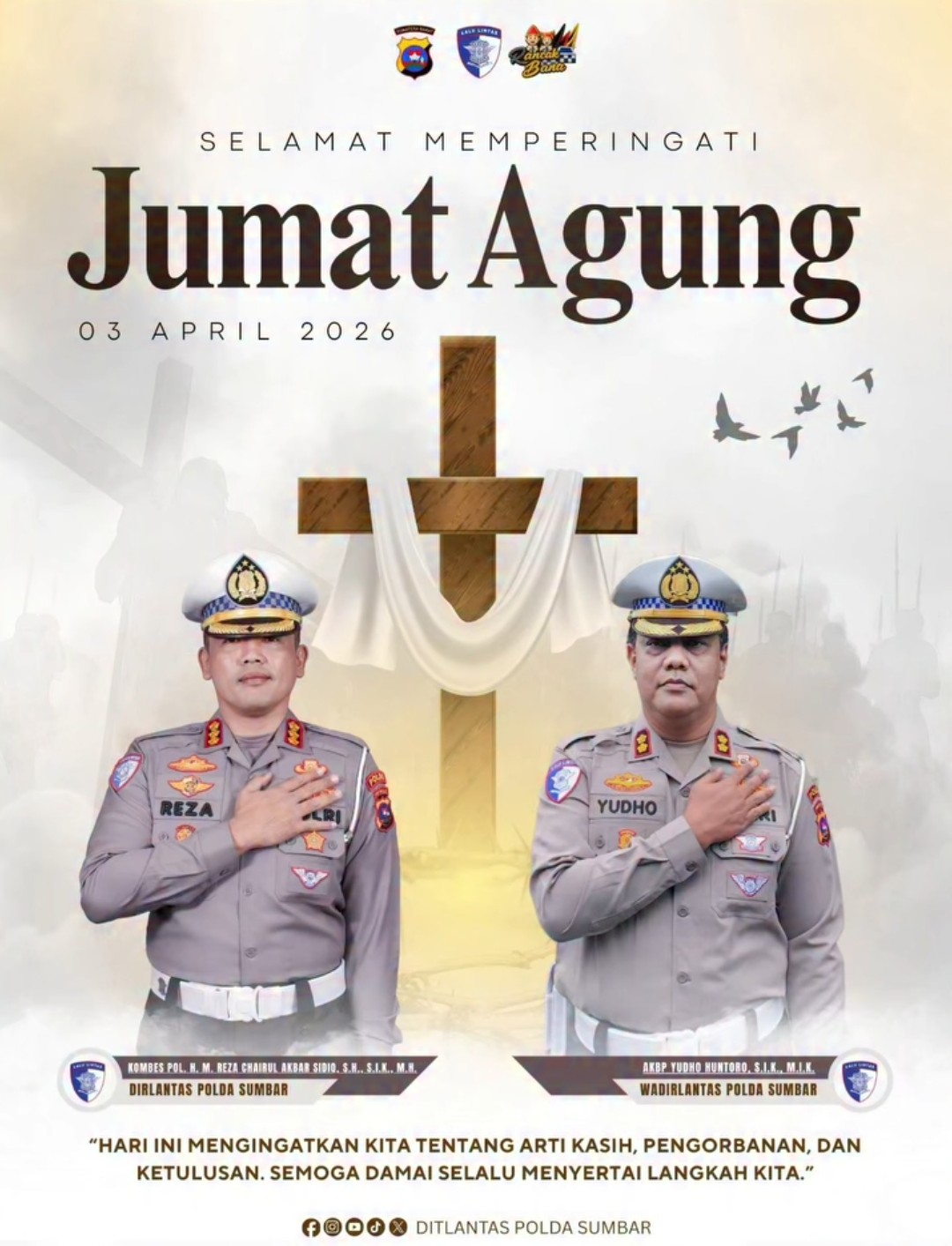 SUMBAR | Peringatan Jumat Agung yang jatuh pada 3 April 2026 menjadi momentum reflektif bagi jajaran Direktorat Lalu Lintas Polda Sumatera Barat. Dalam suasana penuh khidmat, Dirlantas Reza bersama Wadirlantas Yudho menyampaikan pesan mendalam tentang arti kasih, pengorbanan, dan ketulusan dalam menjalankan tugas sebagai aparat negara.